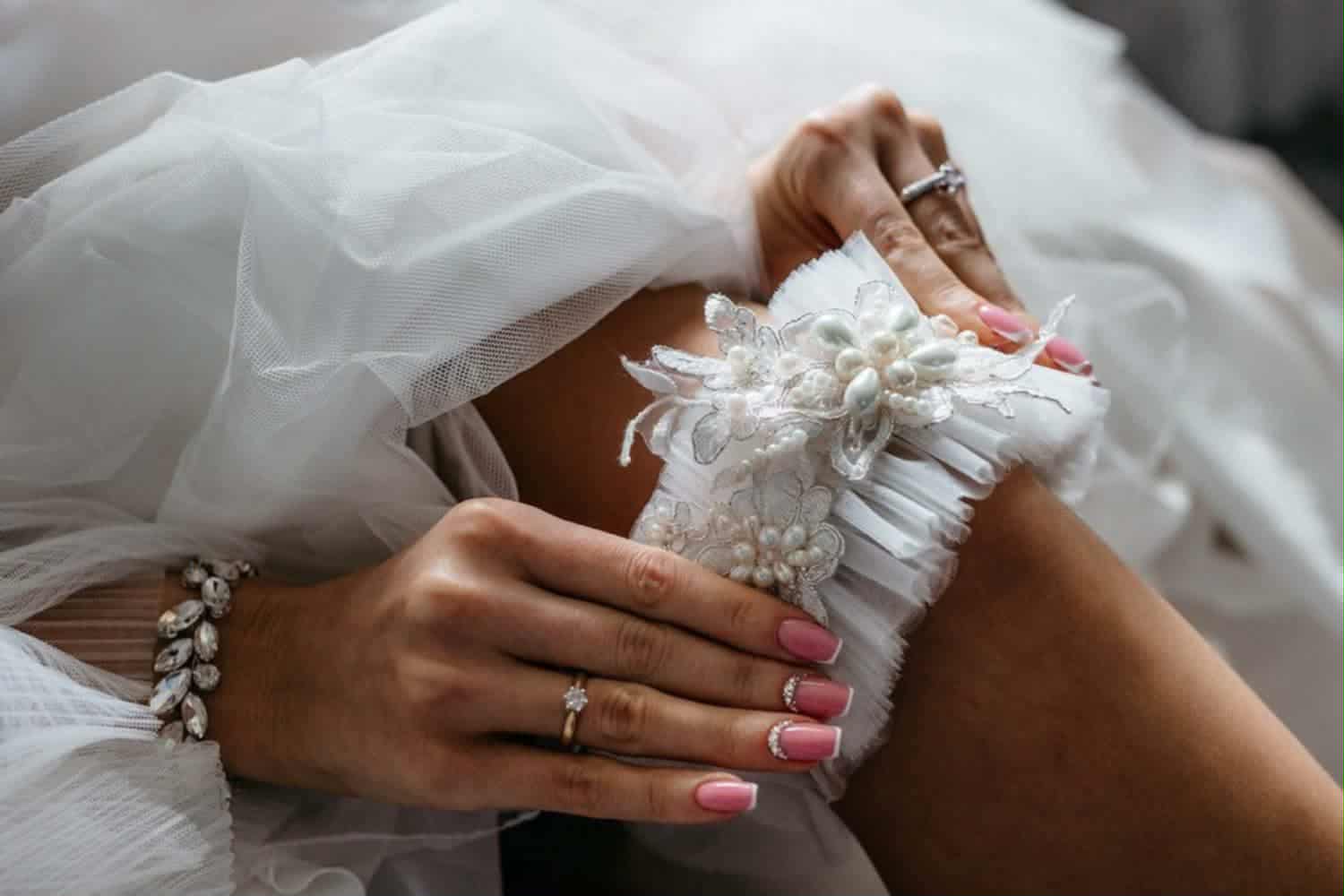 Biała podwiązka ślubna z aplikacją z koronki i perłami