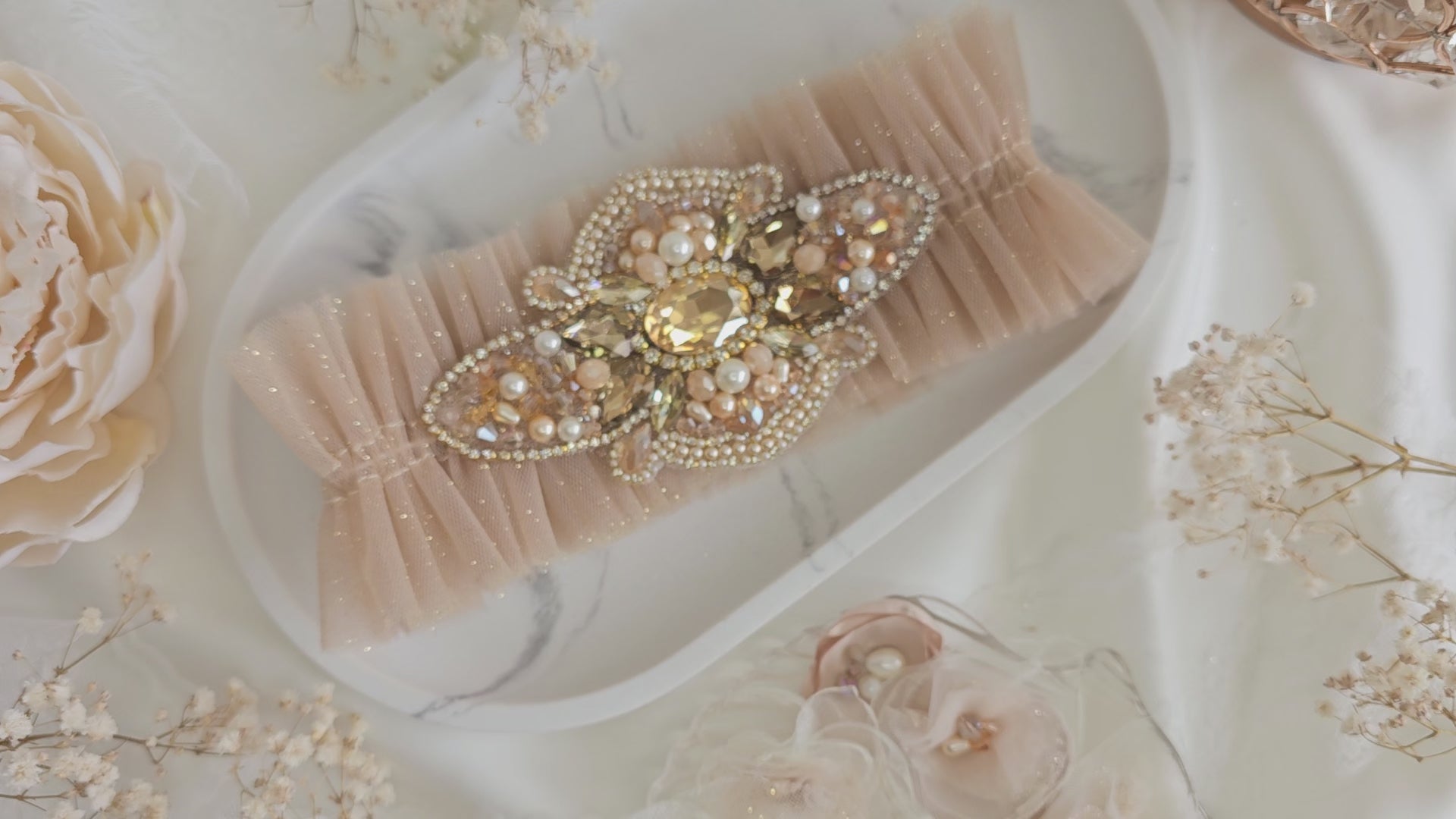 Elegancka, luksusowa podwiązka w kolorze jesieni, wykonana z tiulu z brokatem i ozdobiona ręcznie wykonaną aplikacją z diamencików i cyrkoni. Ta podwiązka emanuje wyrafinowaniem i luksusem, a ręcznie wykonana aplikacja dodaje jej wyjątkowego blasku. Kolor jesieni wprowadza nutę ciepła i przytulności, tworząc niezwykle romantyczny i kobiecy akcent. Idealna dla Panien Młodych, które szukają wyjątkowego i stylowego dodatku do swojego ślubnego stroju. Ta podwiązka jest prawdziwym arcydziełem elegancji i luksusu.