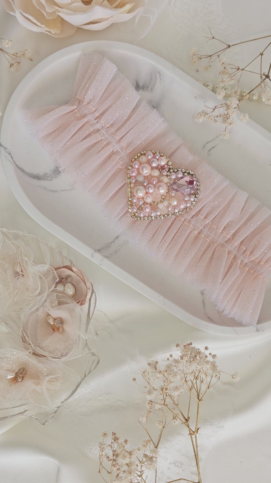 Model podwiązki ślubnej wykonany z tiulu w kolorze różowym z delikatnym brokatem oraz aplikacją serce-ręcznie wykonaną. Całość tworzy niezwykle romantyczny akcent ślubnej stylizacji.