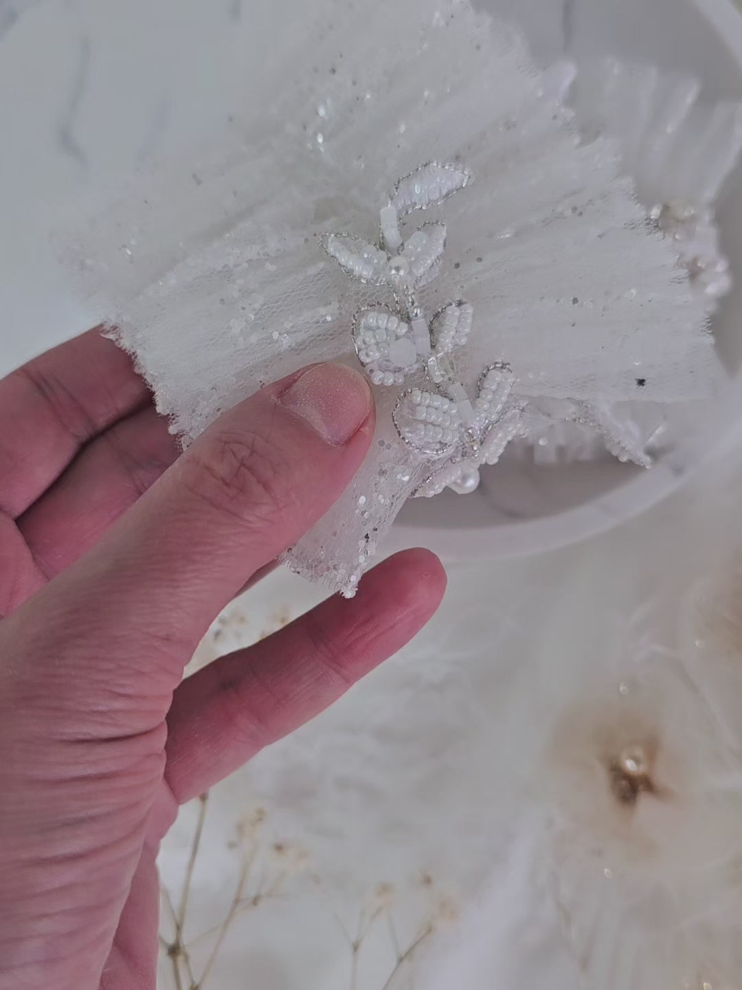 Elegancka, luksusowa podwiązka  wykonana z białego tiulu ozdobiona ręcznie wykonaną aplikacją z diamencików i cyrkoni oraz bogato wyszywana koralikami.Ta podwiązka emanuje wyrafinowaniem i luksusem, a ręcznie wykonana aplikacja dodaje jej wyjątkowego blasku. Zdobienie wprowadza nutę ciepła i przytulności, tworząc niezwykle romantyczny i kobiecy akcent. Idealna dla Panien Młodych, które szukają wyjątkowego i stylowego dodatku do swojego ślubnego stroju. Ta podwiązka jest prawdziwym arcydziełem elegancji i luksusu.