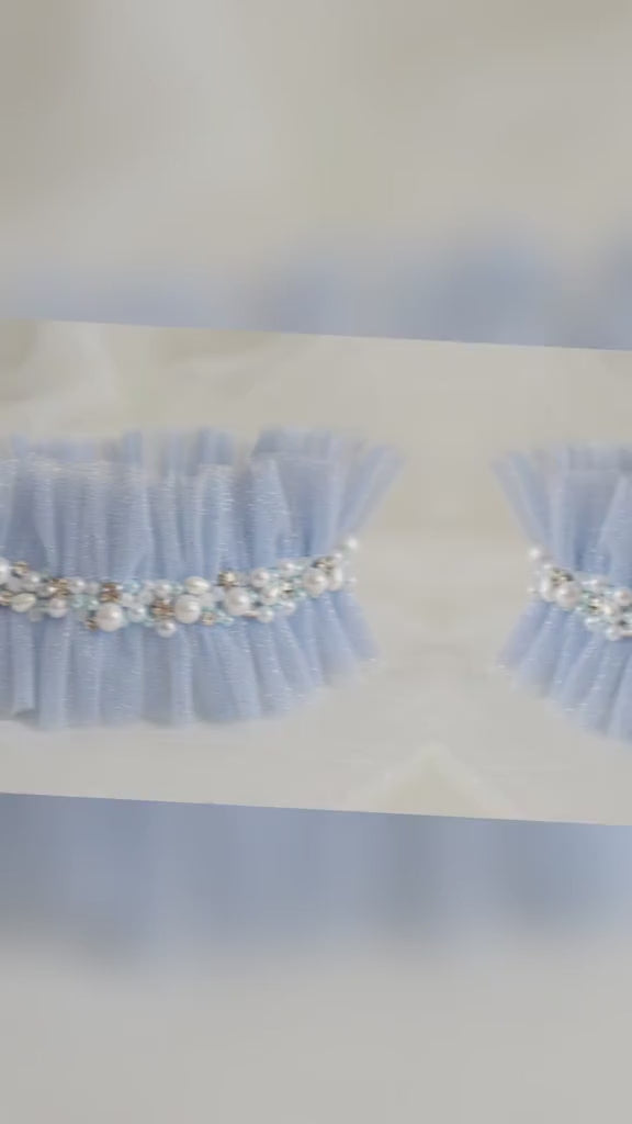 Niezwykle delikatny model podwiązki wykonany z tiulu z dodatkiem srebrnej poświaty oraz ozdobiona perełkami I cyrkoniami.