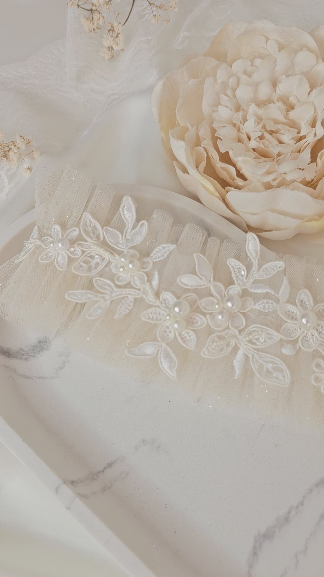 Kolekcja Pearls.Podwiązka z tiulu z koronką i perłami